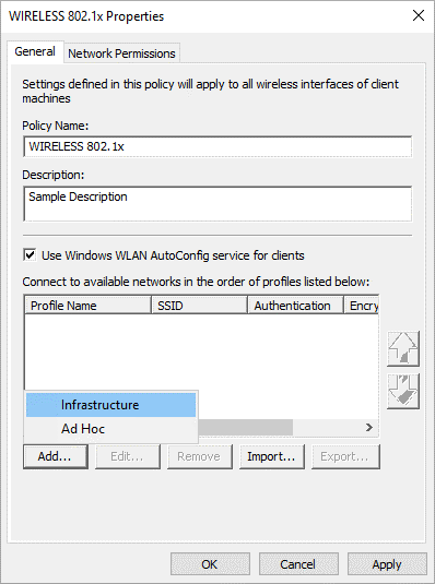 10. In the window that appears, in the General tab, give this new policy a name (e.g.WIRELESS 802.1x).