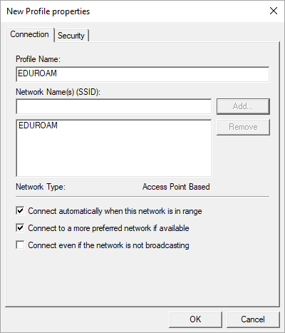 12. In the displayed window (New Profile properties) complete the Profile Name field, e.g. EDUROAM.