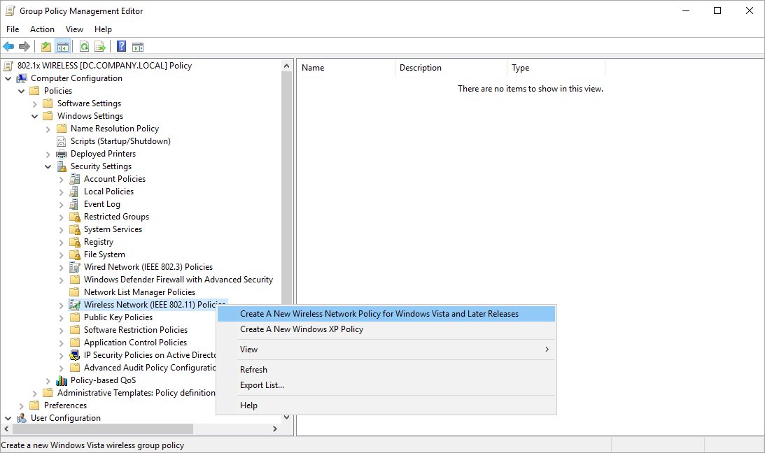 9. Go to the Security Settings (Computer Configuration > Policies > Security Settings), then right-click on Wireless Network (IEEE 802.11) Policies, then select: Create A New Wired Network Policy for Windows Vista and Later Releases.