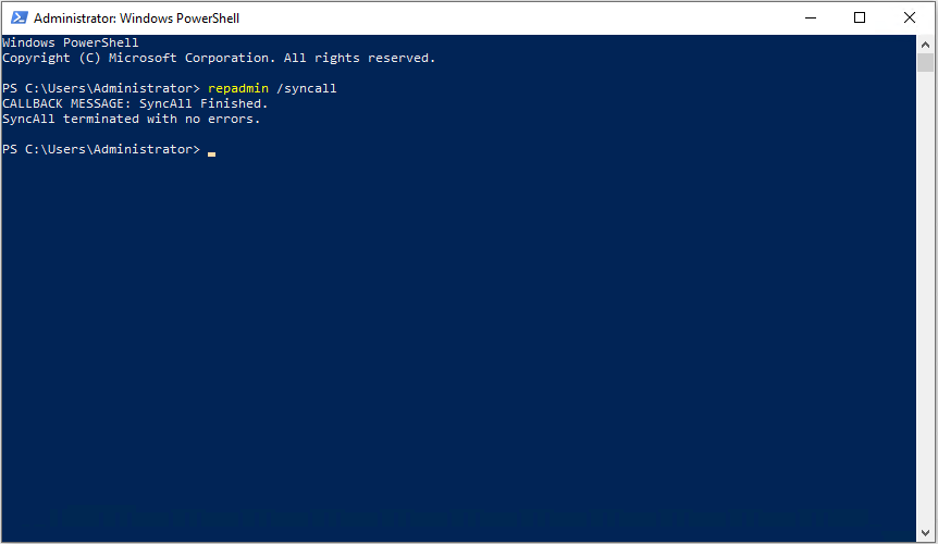 17. If you want to speed up a replication of the new GPO, run (with the administrator privileges) PowerShell program on the server where you have set it up. Use the repadmin /syncall and confirm the command. If your replication is successful, you will see a message saying: “SyncAll terminated with no errors”.