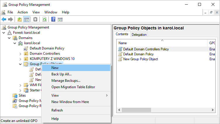 3. Right-click on the Group Policy Object and select: New.
