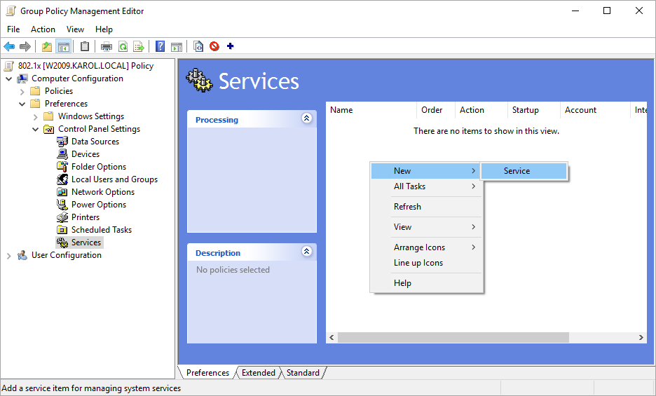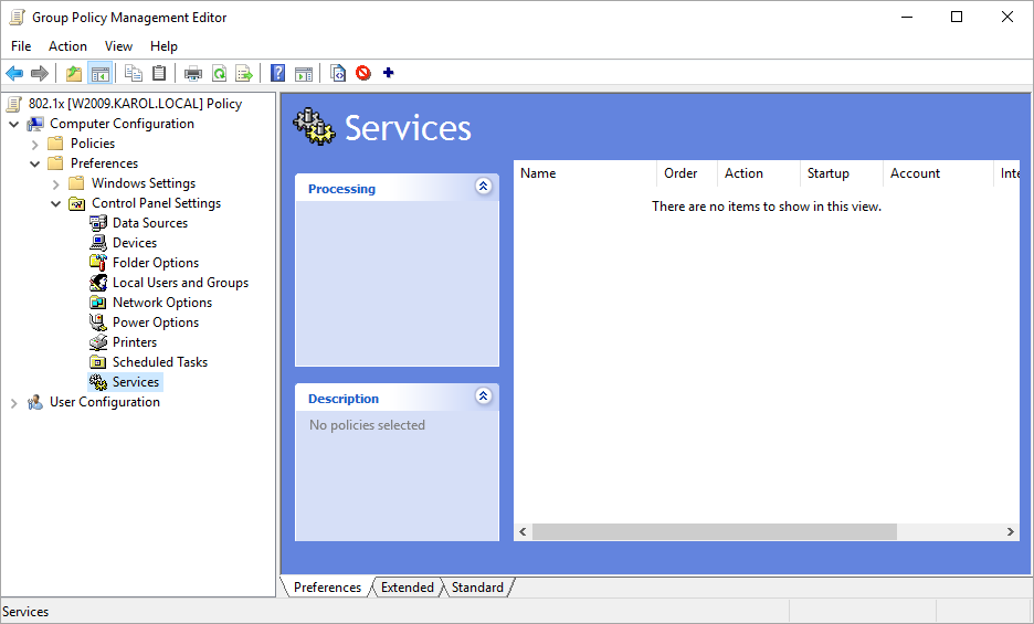 6. In the window: Group Policy Management Editor, search for: Services (Computer Configuration > Preferences > Control Panel Settings > Services).