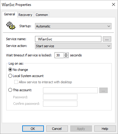 8. Set the parameters as shown on the screen below (service WlanSvc) to configure the automatic launch of the supplicant service on the Windows end-user computers. The Recovery and Common tabs leave unchanged. Save it all confirming OK .