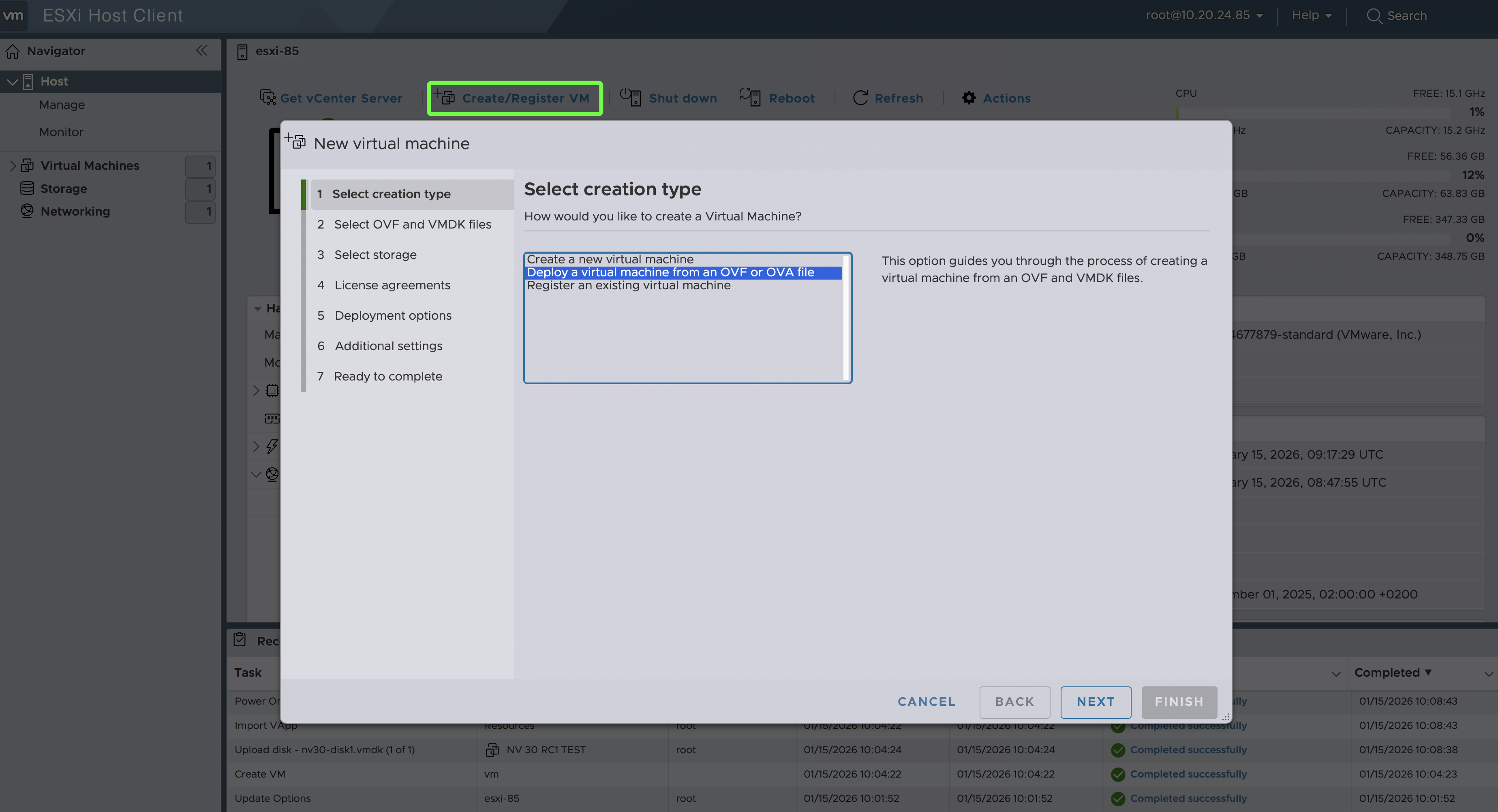 Log in to the ESXi Host Client. From the top menu, click *Create/Register VM*, then select the middle option *Deploy a virtual michine from…*. Click the NEXT button.