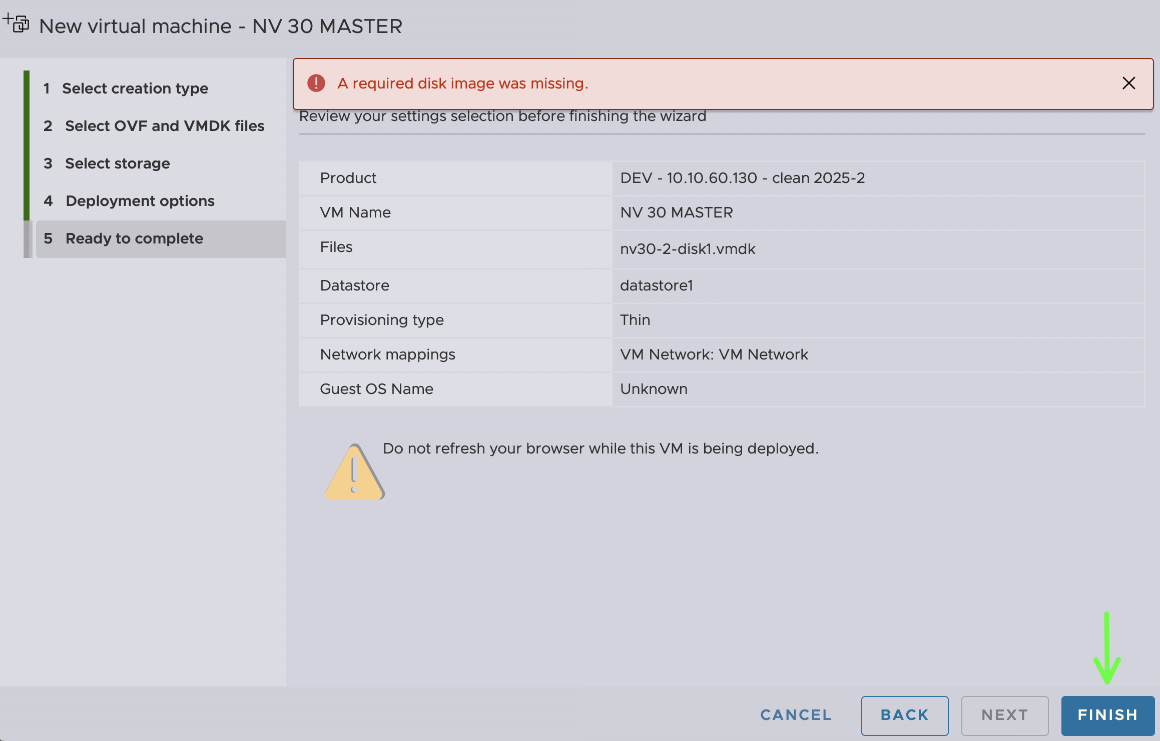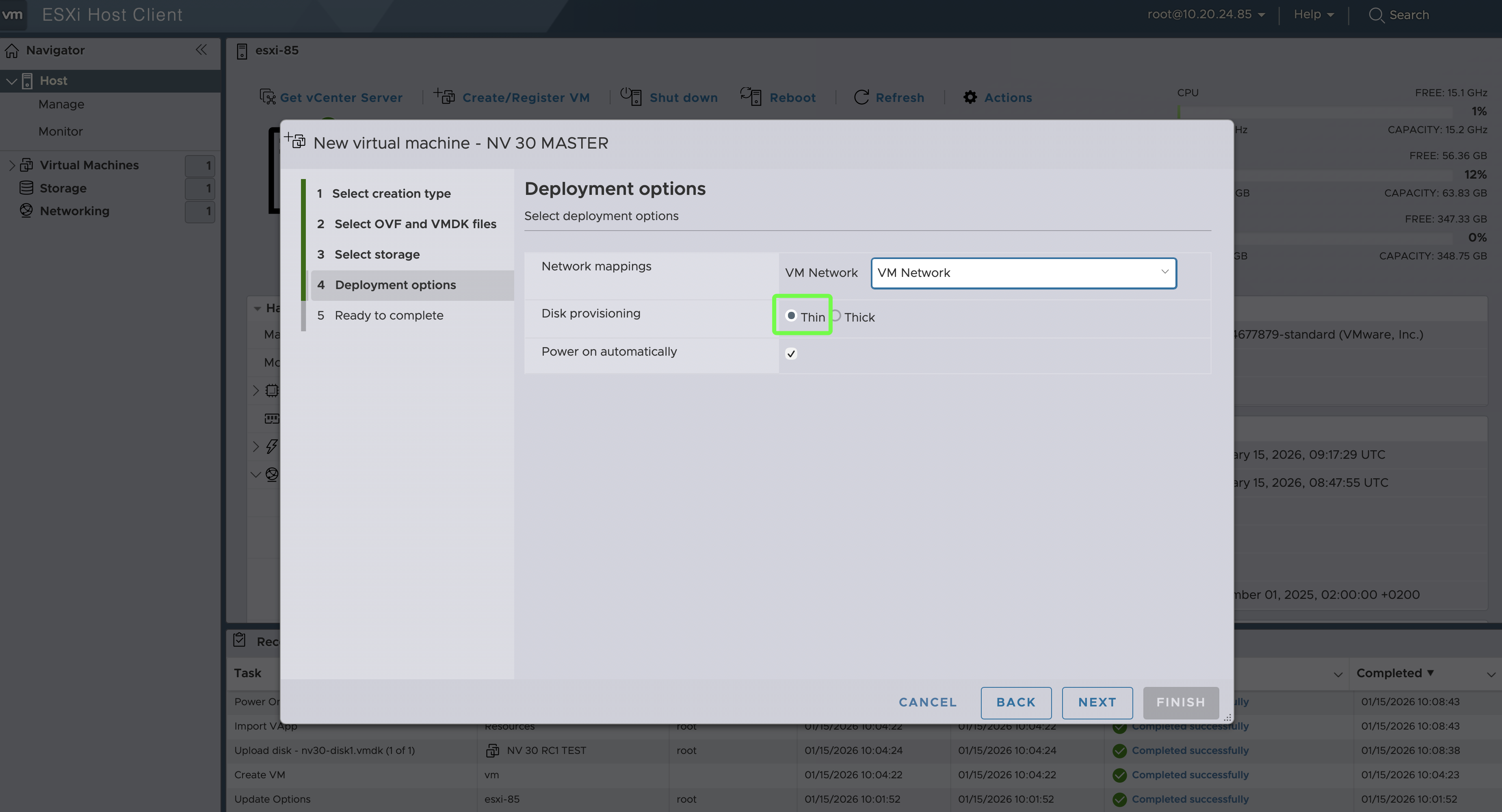 Select the appropriate VM Network, set the *Disk provisioning* parameter to Thin.