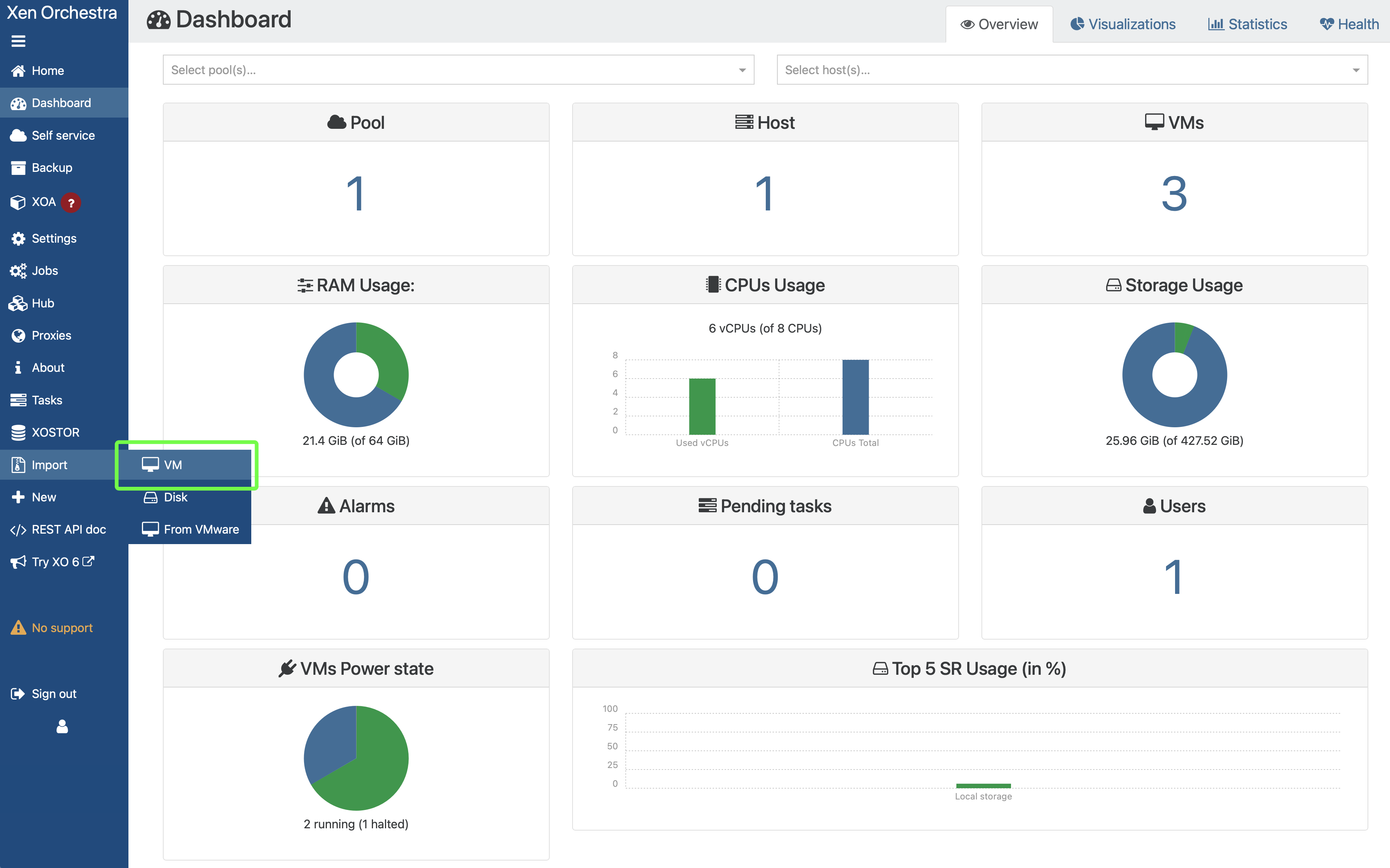 Log in to XOA. From the menu on the left, select *Import* and then *VM*.