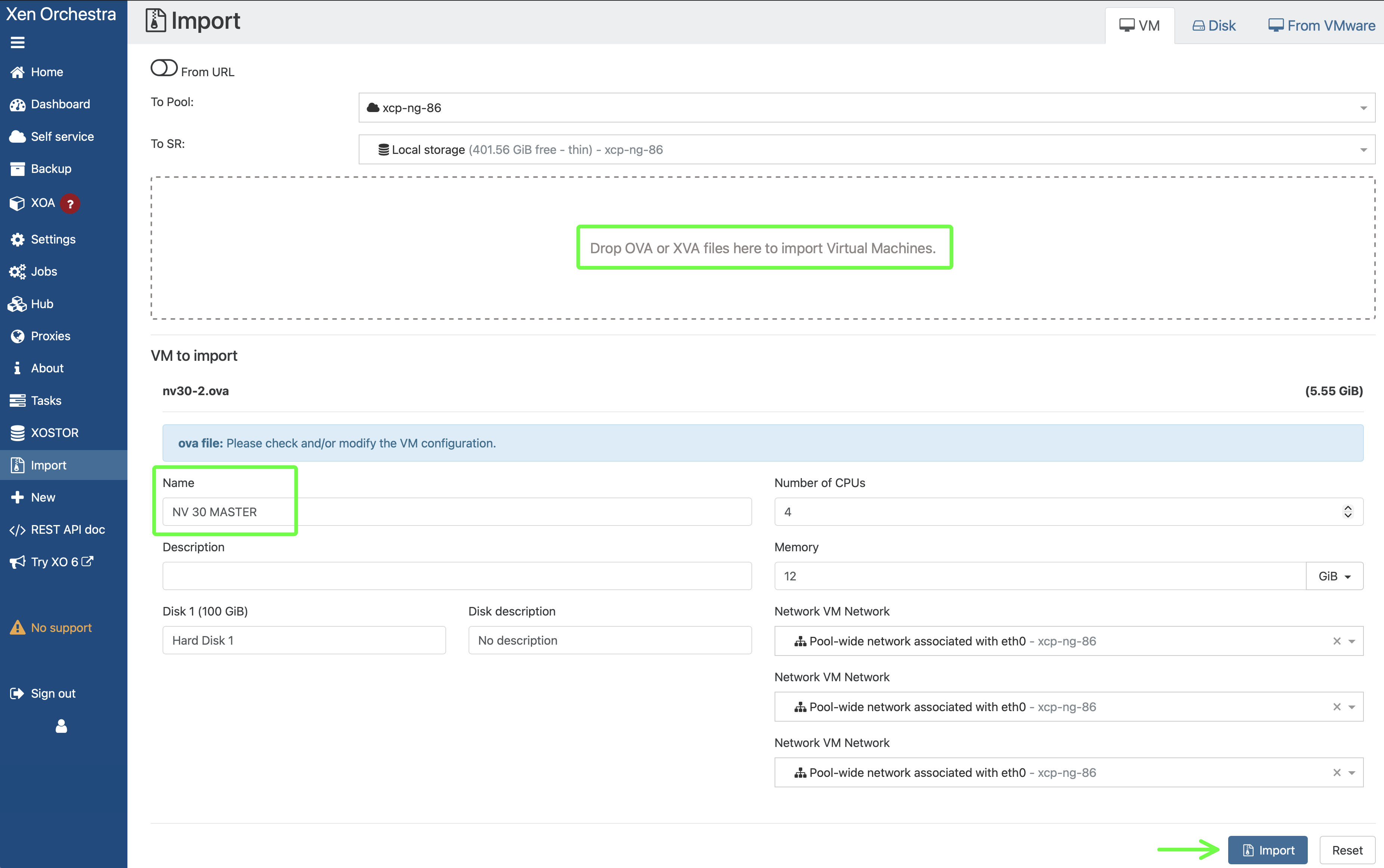 Upload the NACVIEW image to XOA, set the Name. Adjust the amount of RAM and vCPU and connect the network interfaces to the appropriate networks on XCP-ng.