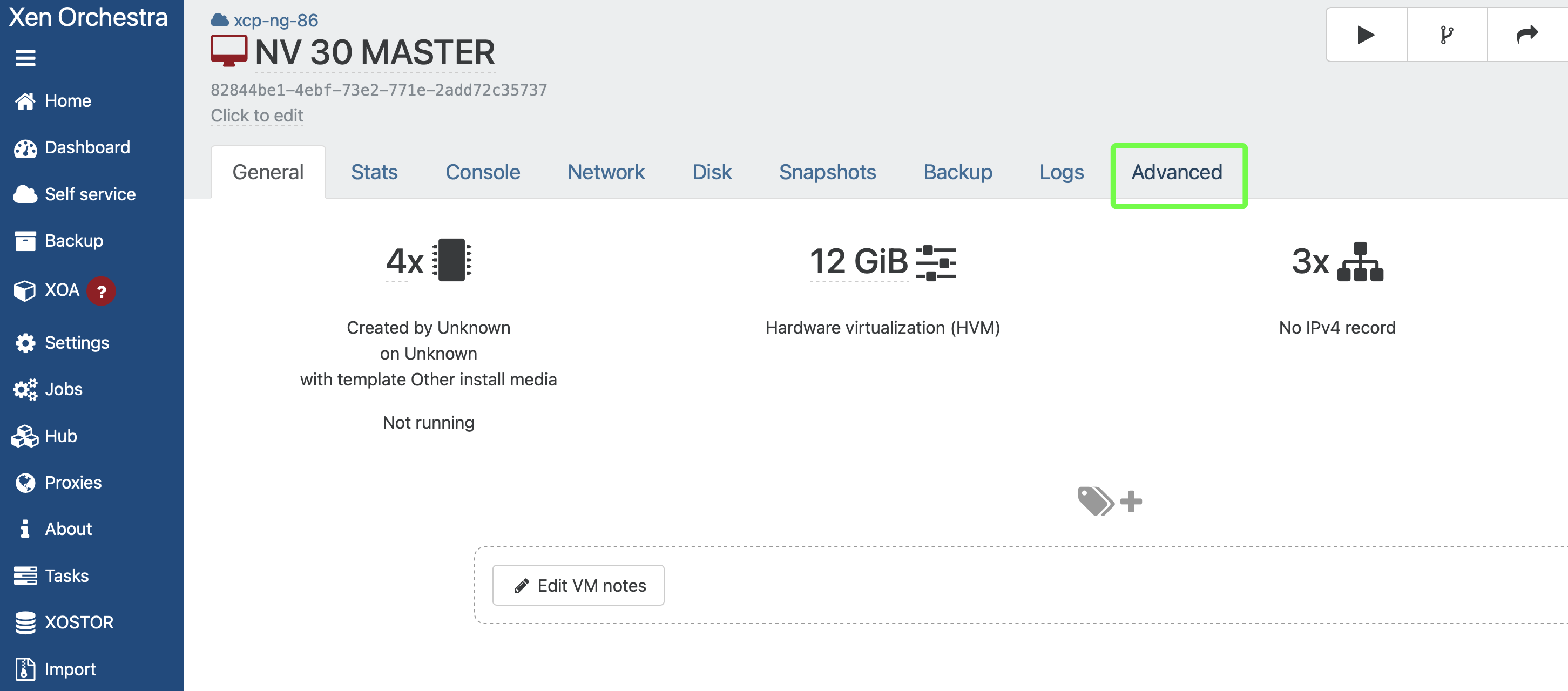 After the import is complete, XOA will automatically switch to the virtual machine view. Do not start the VM yet. Go to the virtual machine settings in the *Advanced* tab.