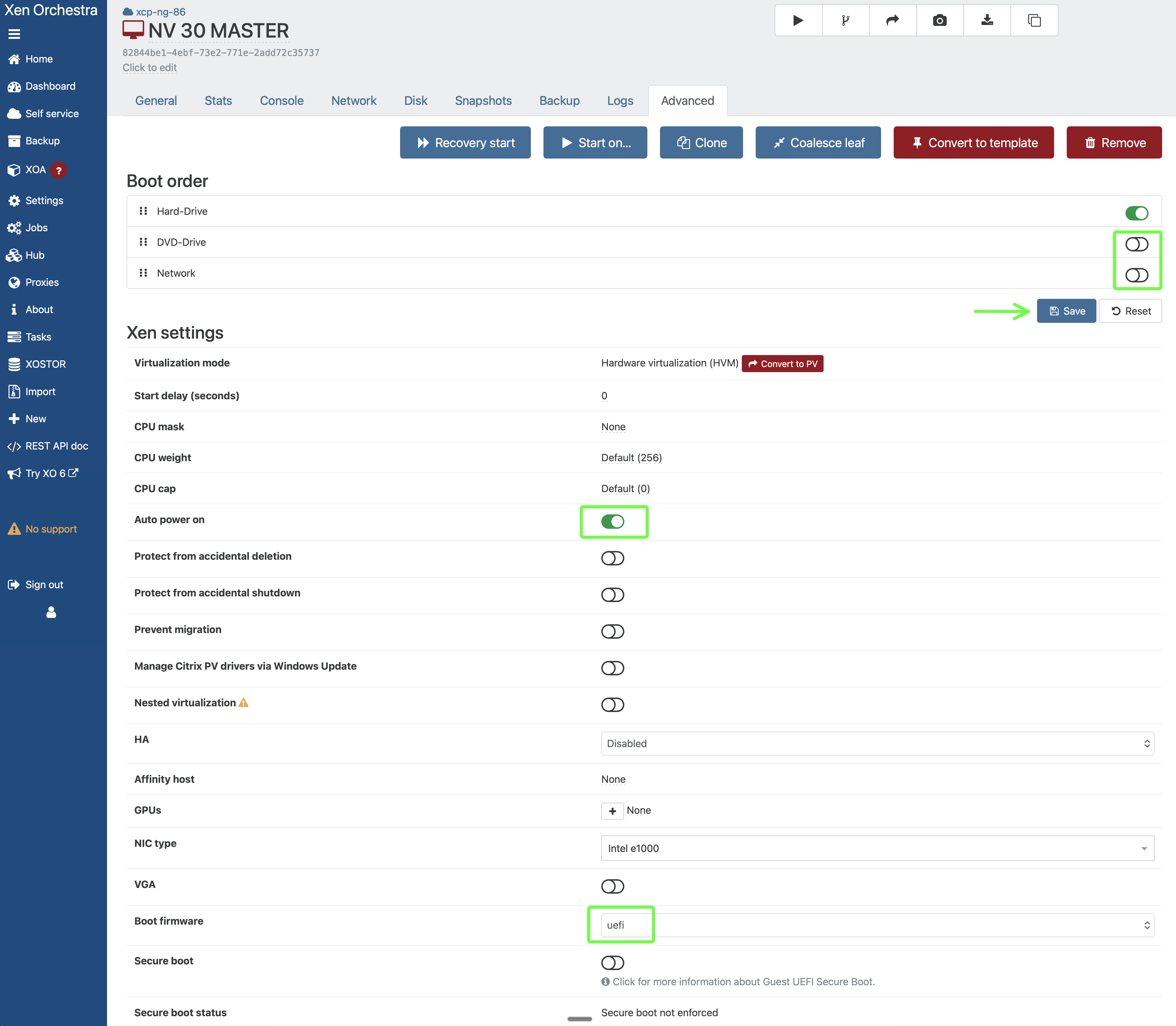 5. Modify the virtual machine configuration by disabling the *Network* and *DVD-Drive* options in the *Boot order* section. In the *Xen settings* section, change the following options: *Boot firmware* to uefi (this is important). Set Auto power on, optionally (but also recommended) *Protect from accidental deletion* and also: *Protect from accidental shutdown*. Do not forget to save the new settings by clicking the Save button.